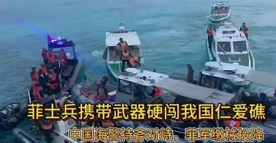 菲士兵攜帶武器硬闖我國仁愛礁,中國海警持斧對峙,菲軍繳械投降