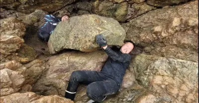 小明發現巨石底下有動靜,叫來阿峰一起配合抓出一窩生猛的值錢大貨