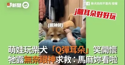 萌娃玩柴犬Q彈耳朵笑開懷 狗狗露無奈眼神求救