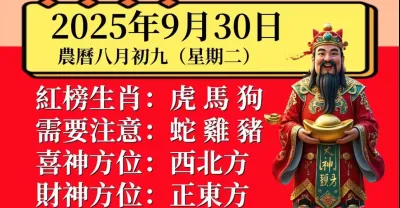 明日小運播報~2025 年 9 月 30 日(星期二)農曆八月初九